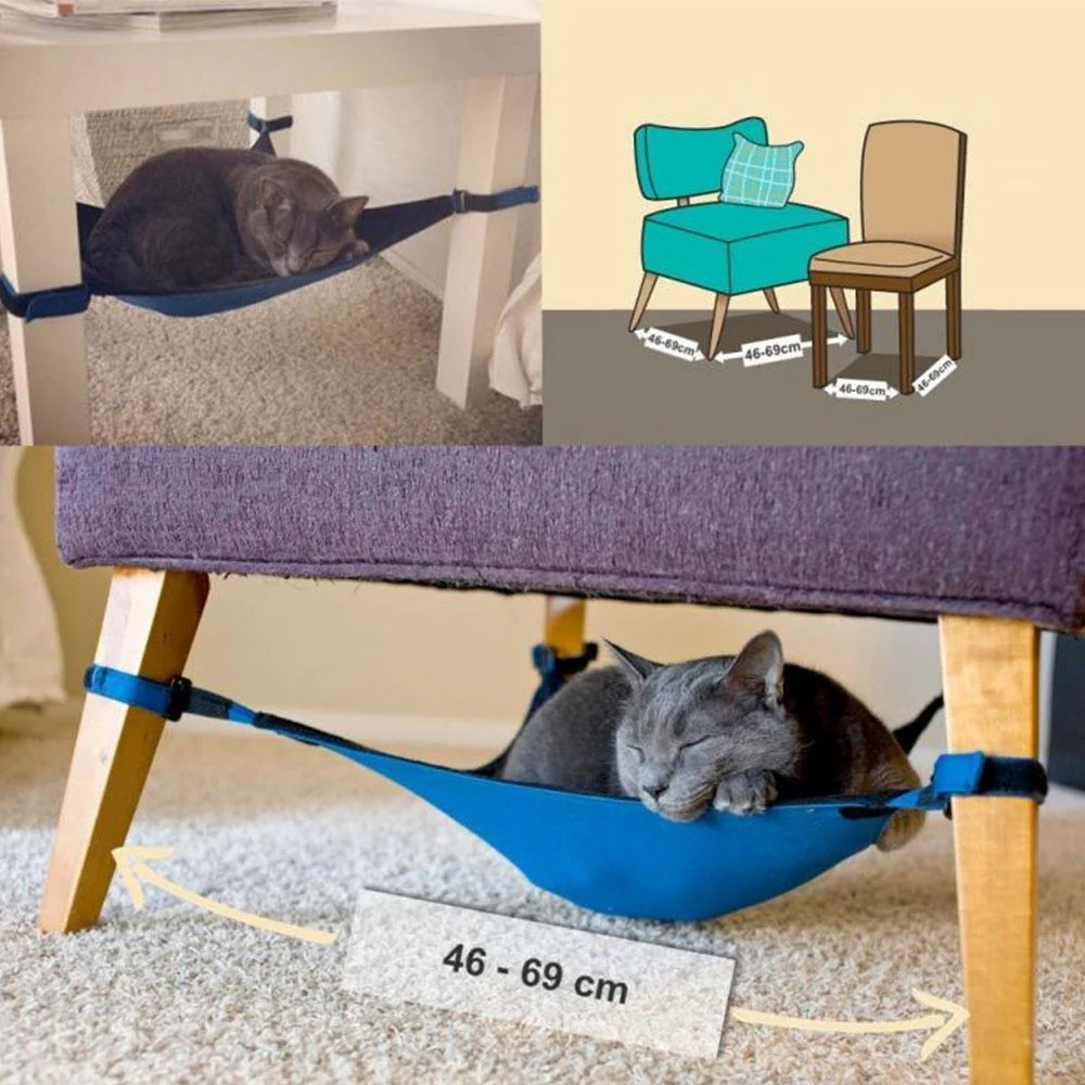 Die Hängematte unter dem Stuhl lässt sich in Sekundenschnelle befestigen, indem sie mit den vier an der Hängematte befestigten Gurten an jedem Stuhlbein befestigt wird. Sein einzigartiges Design ermöglicht es, auf den Beinen der Stühle zu sitzen und nicht nach unten zu rutschen, sodass Ihre Katze wie eine echte Hängematte in der Luft sitzt.